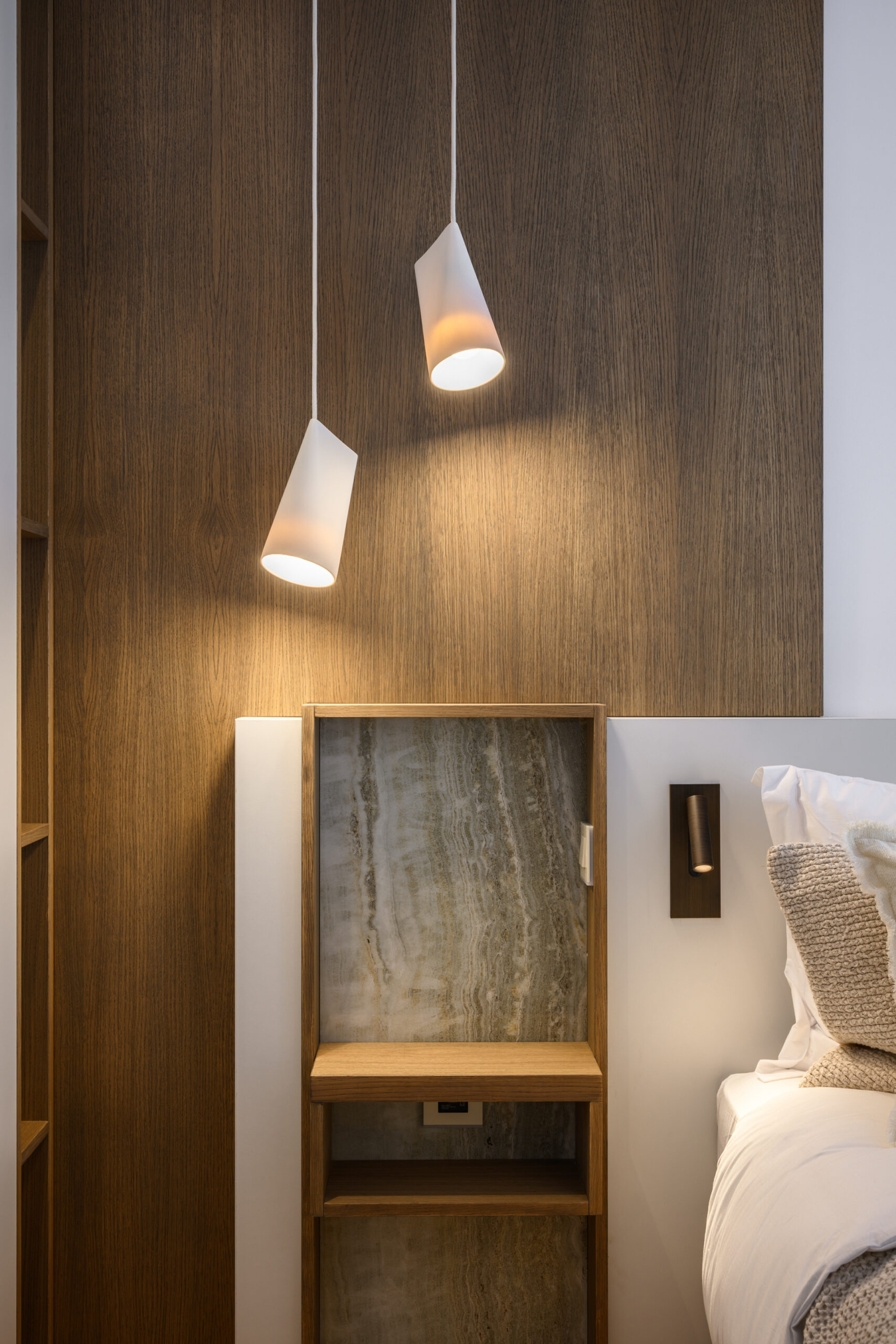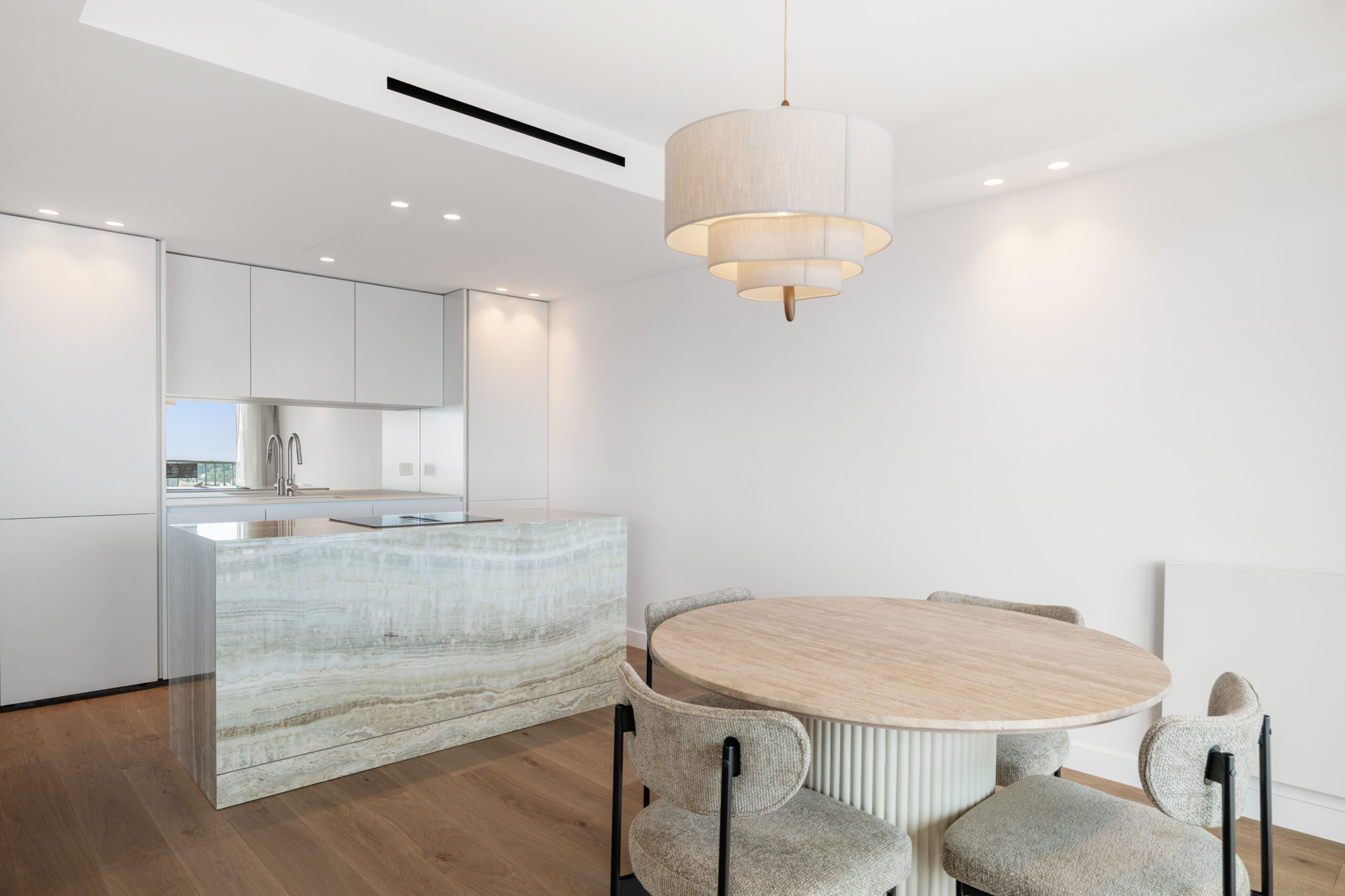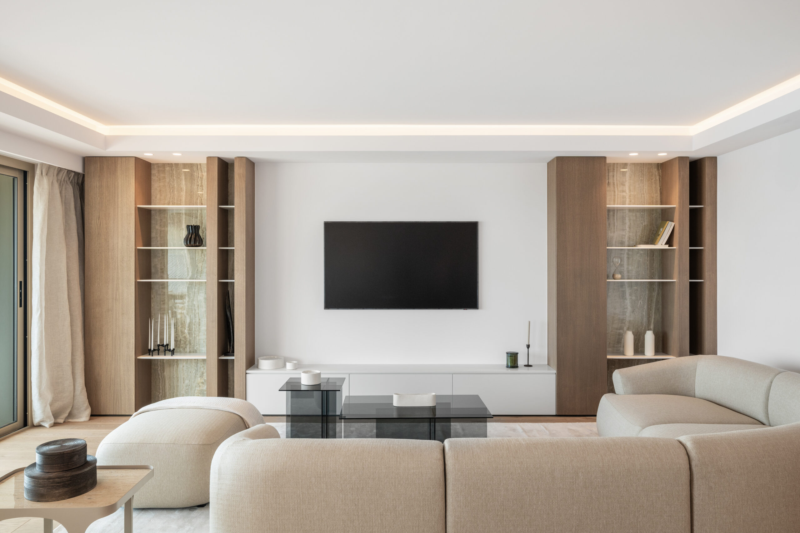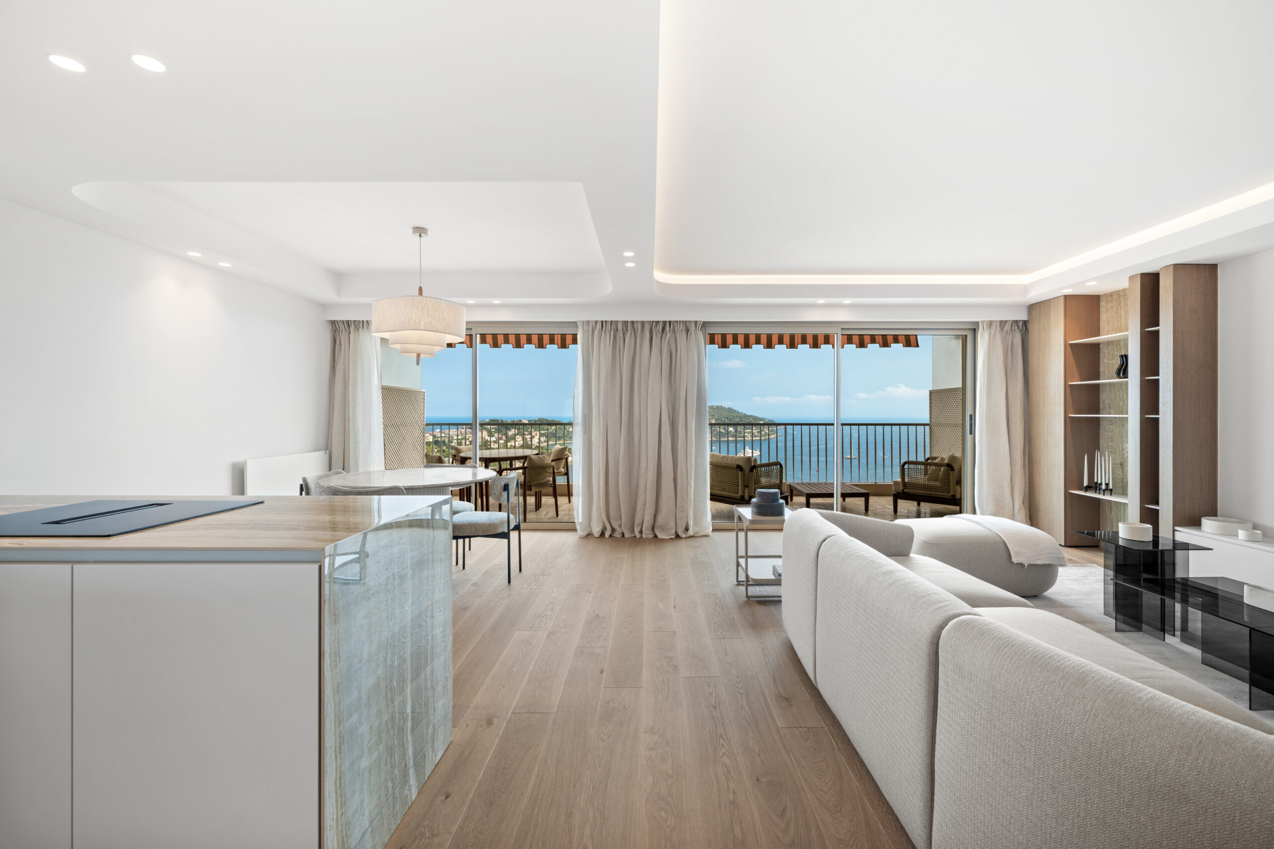 Un espace lumineux et aérien, ouvert sur la Méditerranée, où parquet raffiné et travertin vert sauge se rencontrent dans une élégance contemporaine.